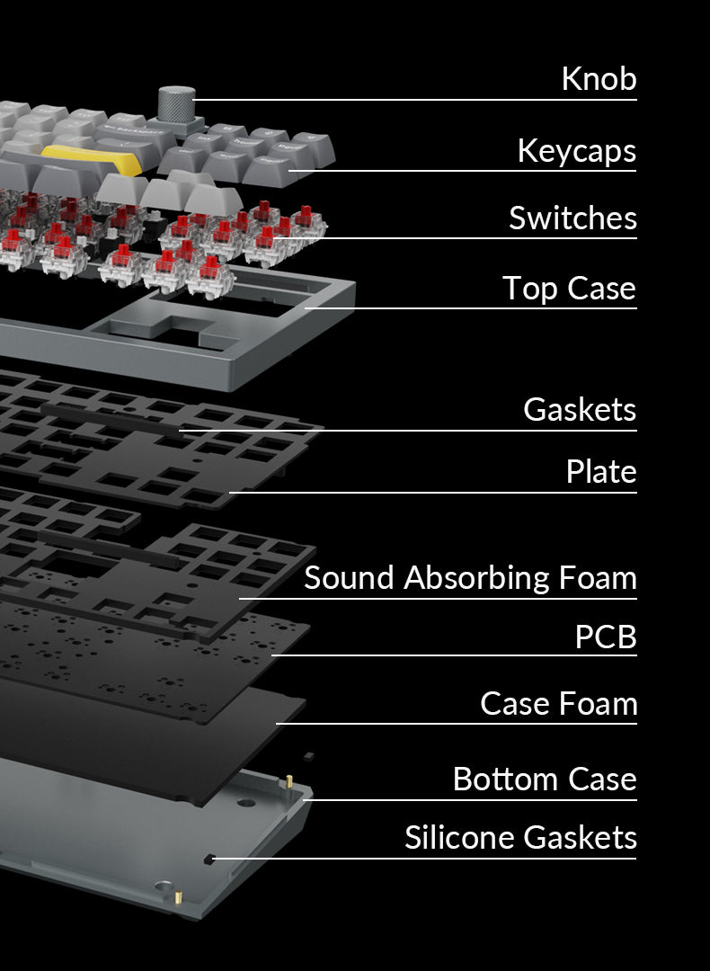 The Double Gasket Design is a new innovative structure in the industry. In addition to the gaskets on the plates, we added silicone pads between the top and bottom cases to significantly reduce the sound resonance between the metals and reduce the noise of the impacted metals. This design allows the keyboard to maintain the flexibility of the gasket structure and improves the overall typing sound.